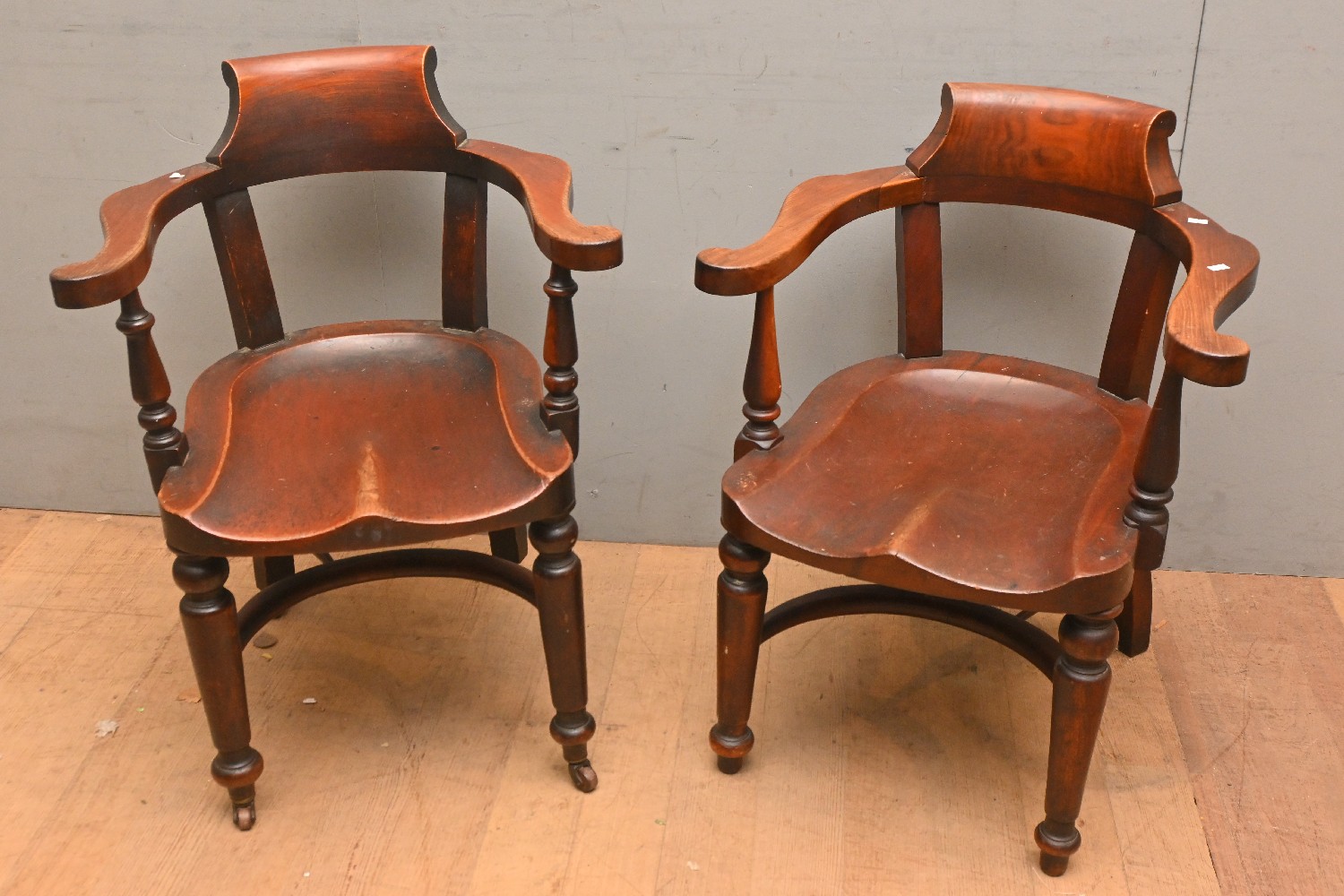 A PAIR OF LATE 19TH CENTURY MAHOGANY BOW-BACK ELBOW CHAIRS - ONE ON CASTORS (A/F) (79H X 61W X 59D CM) (LEONARD JOEL DELIVERY SIZE: X-LARGE)