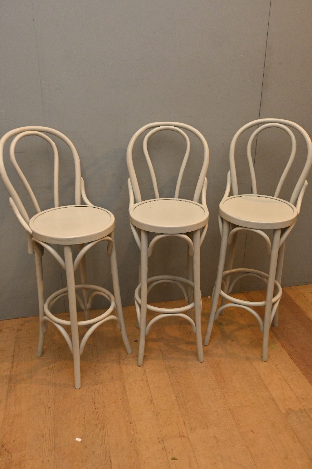 A SET OF THREE PAINTED BARSTOOLS (A/F) (112H X 34W X 37D CM) (LEONARD JOEL DELIVERY SIZE: X-LARGE)