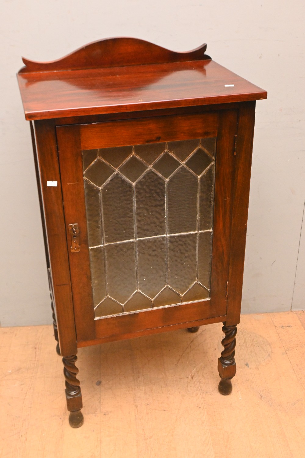 AN OAK LEADLIGHT POT CABINET ON BARLY TWIST LEGS - KEY IN OFFICE (A/F) (105H X 56W X 40D CM) (LEONARD JOEL DELIVERY SIZE: X-LARGE)