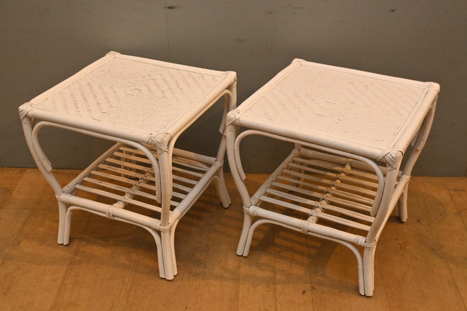 A PAIR OF WHITE WICKER SIDE TABLES (51H X 48W X 48D CM) (LEONARD JOEL DELIVERY SIZE: LARGE)
