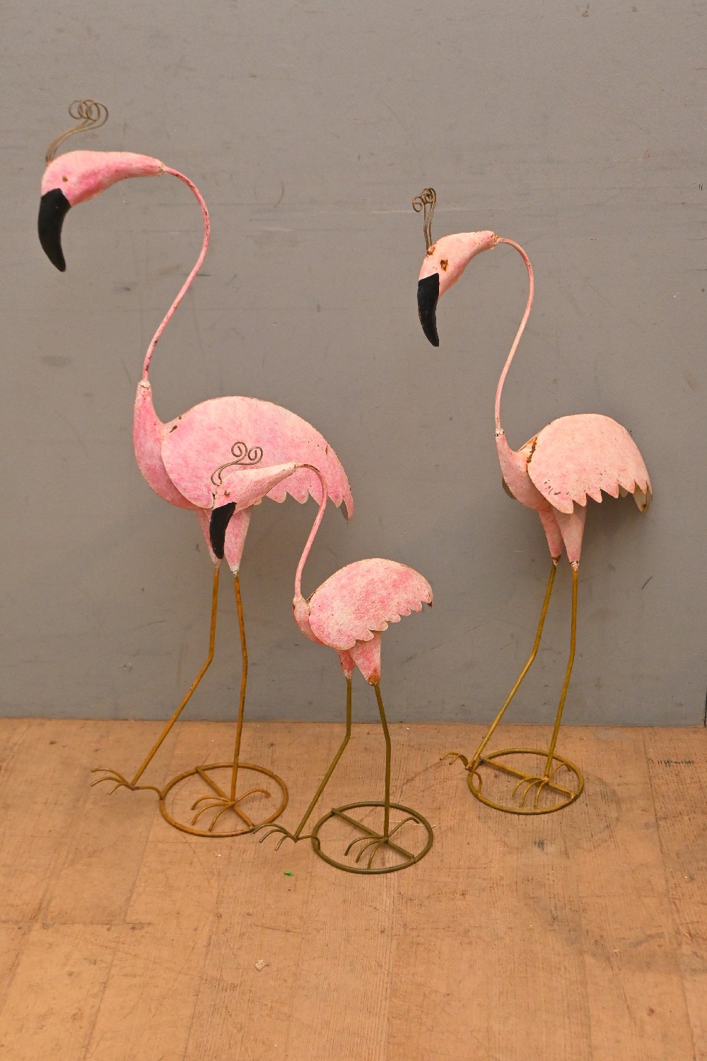 A SET OF THREE VINTAGE METAL GARDEN FLAMINGOES (91H CM) (LEONARD JOEL DELIVERY SIZE: MEDIUM)