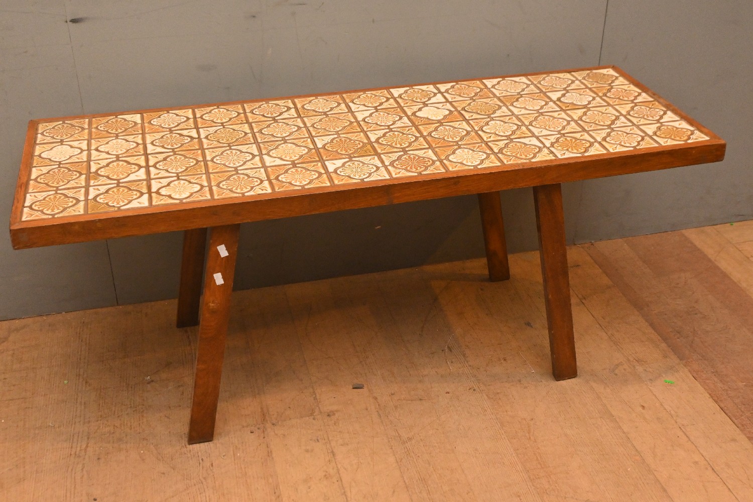 A MID-CENTURY TEAK AND TILE TOP COFFEE TABLE (A/F) (50H X 120W X 42D CM) (LEONARD JOEL DELIVERY SIZE: LARGE)