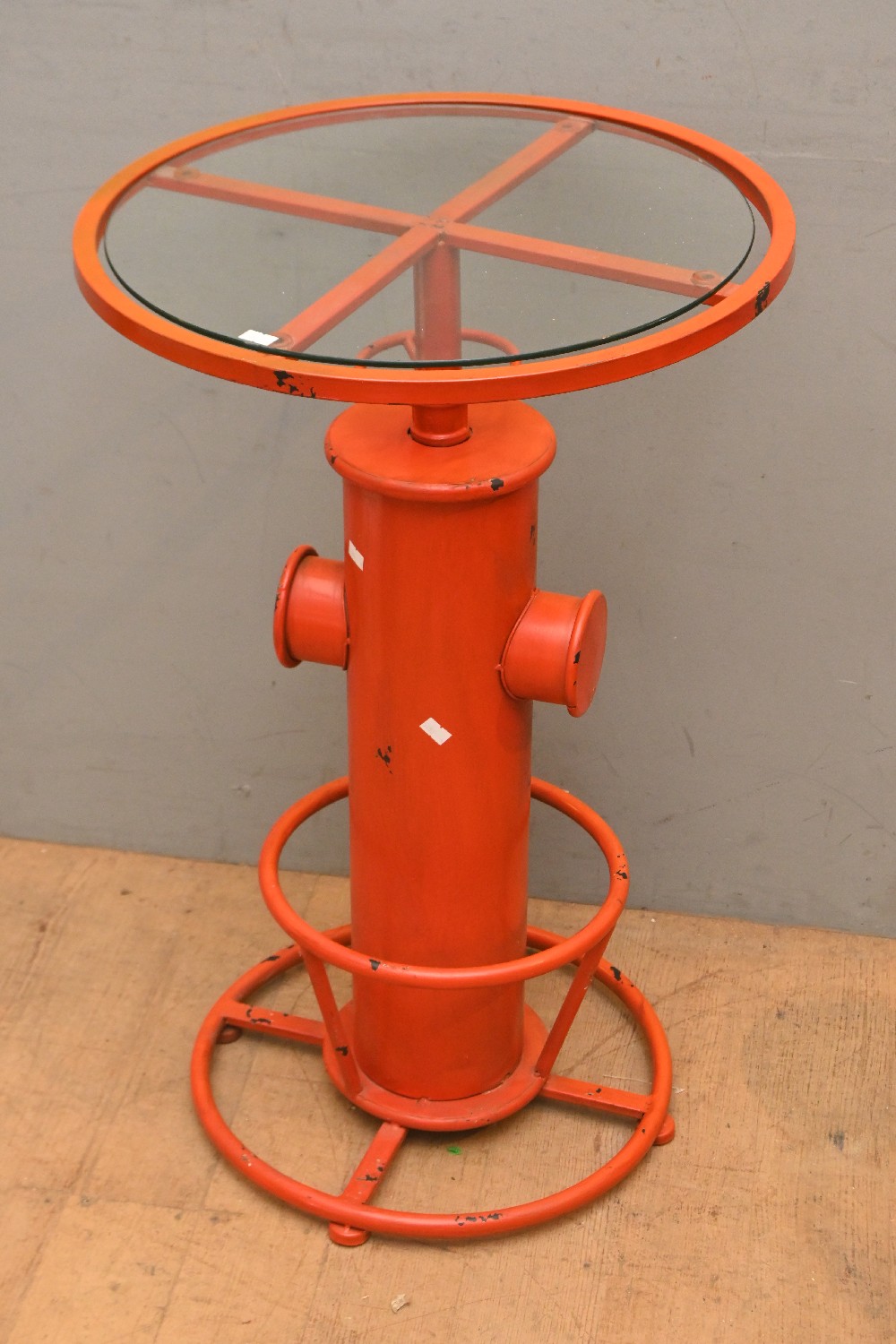 AN INDUSTRIAL STYLE GLASS TOP SIDE TABLE (77H X 48D CM) (LEONARD JOEL DELIVERY SIZE: LARGE)