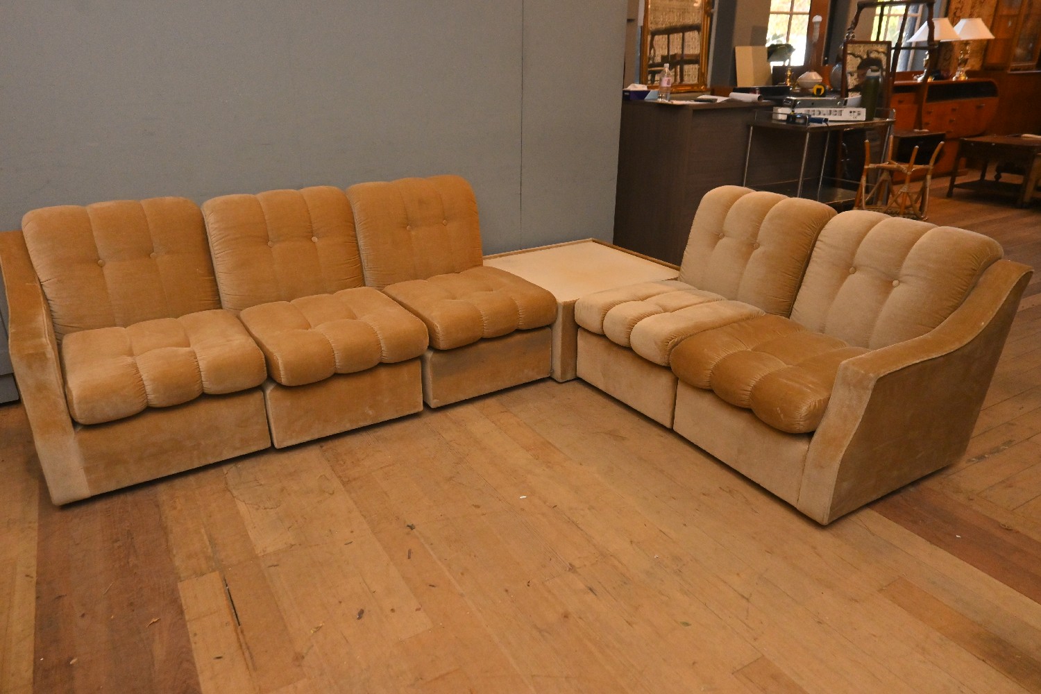 A MID-CENTURY SIX PIECE MODULAR LOUNGE SUITE (A/F) (80H X 272W X 214D CM) (PLEASE NOTE THIS HEAVY ITEM MUST BE REMOVED BY CARRIERS AT THE CUSTOMER'S EXPENSE. LEONARD JOEL STAFF CANNOT ASSIST CARRYING THIS ITEM) (LARGE ITEM)