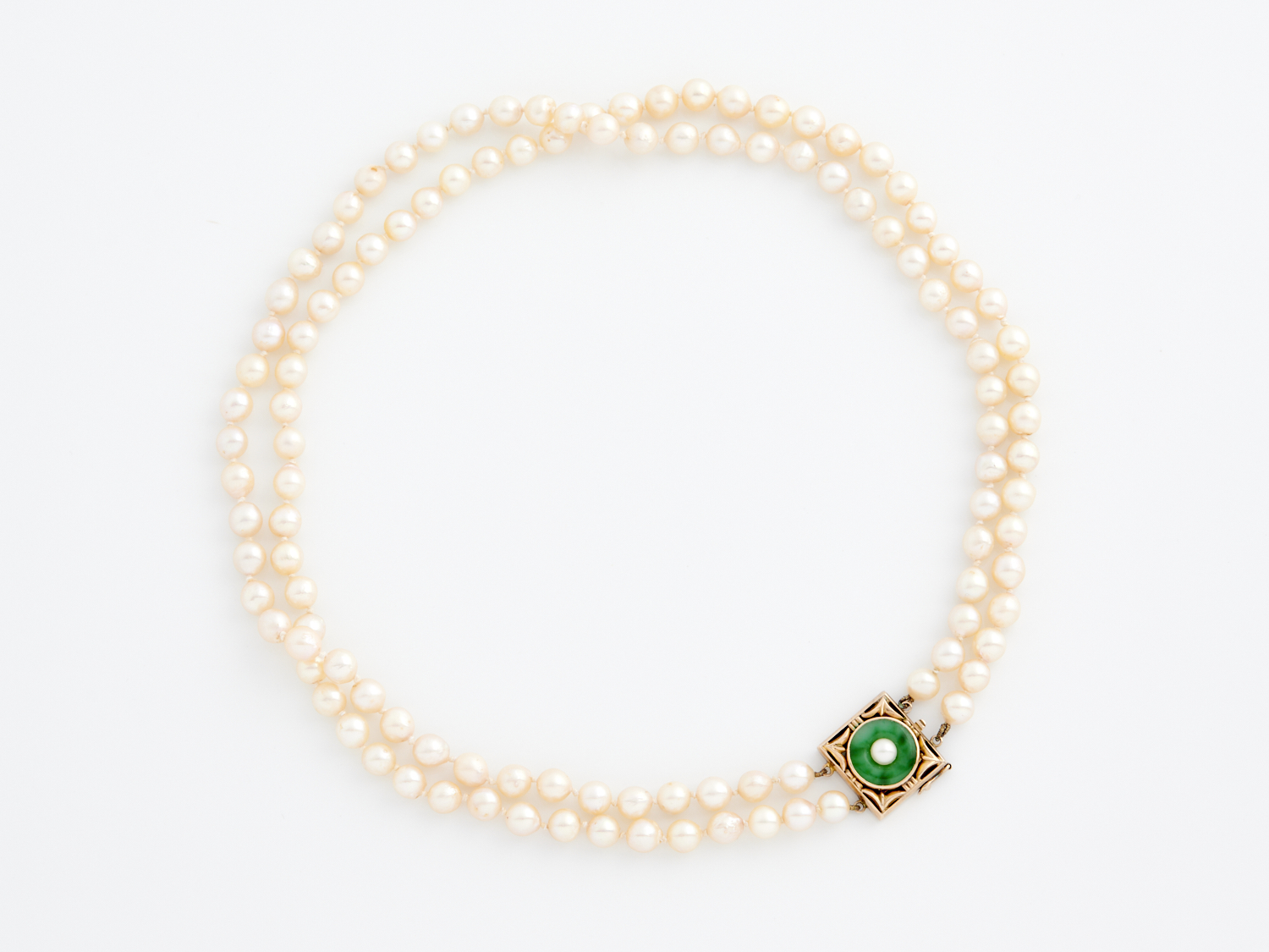 A STAND OF CULTURED PEARLS TO A JADEITE AN PEARL CLASP IN 9CT GOLD, 440MM