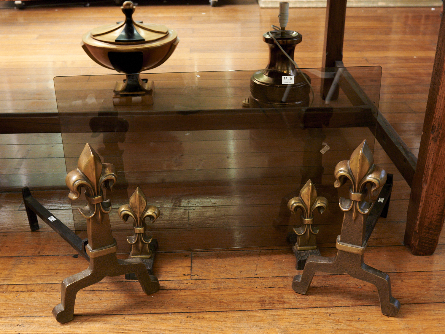 A FRENCH FLEUR DE LIS ANDIRON SET AND MATCHING FIRE SCREEN WITH ORIGINAL SMOKED GLASS H.47CM (SCREEN), LEONARD JOEL LOCAL DELIVERY: MEDIUM