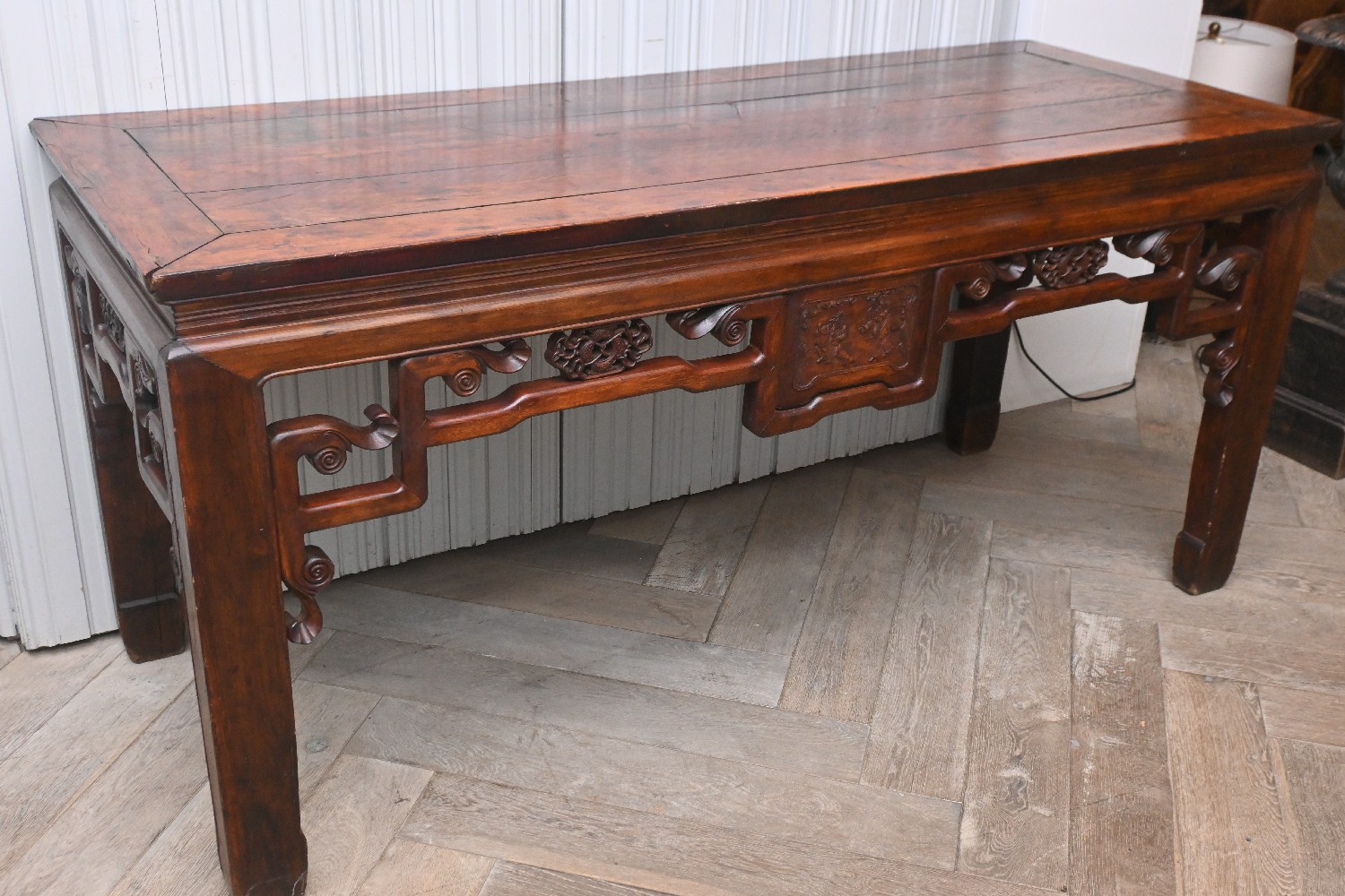 AN ANTIQUE-STYLE CHINESE ELM TABLE (88H X 185W X 74D CM) (PLEASE NOTE THIS HEAVY ITEM MUST BE REMOVED BY CARRIERS AT THE CUSTOMER'S EXPENSE. LEONARD JOEL STAFF CANNOT ASSIST CARRYING THIS ITEM) (LARGE ITEM)