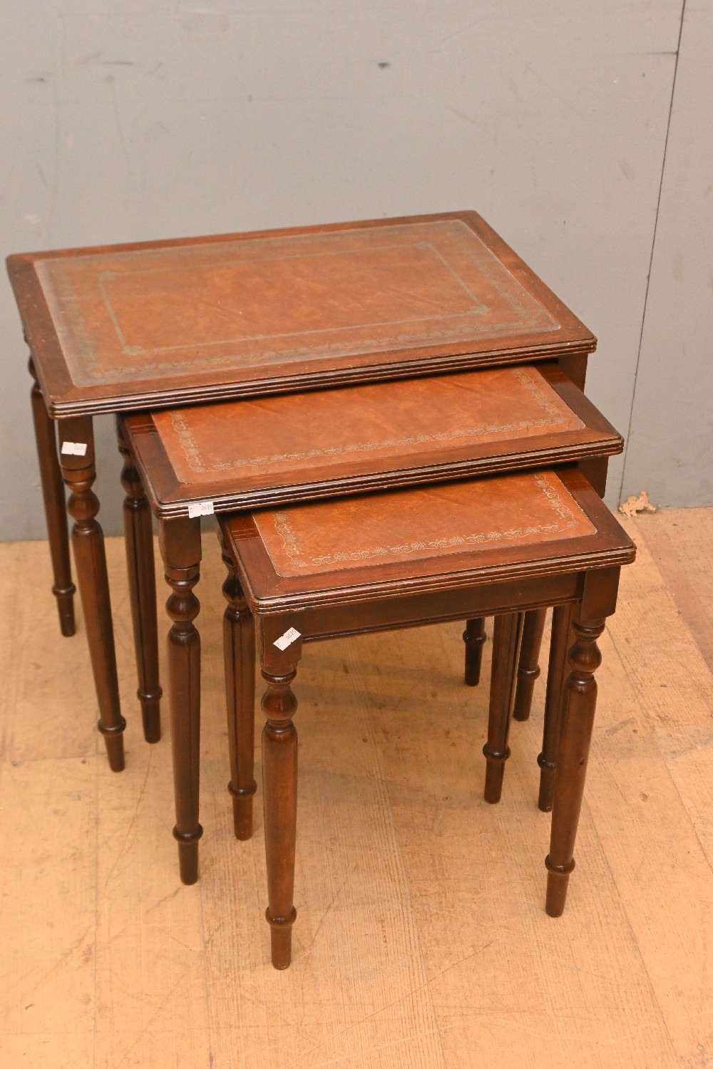 A PETITE NEST OF SIDE TABLES WITH LEATHER INSET (A/F) (50H X 55W X 36D CM) (LEONARD JOEL DELIVERY SIZE: LARGE)