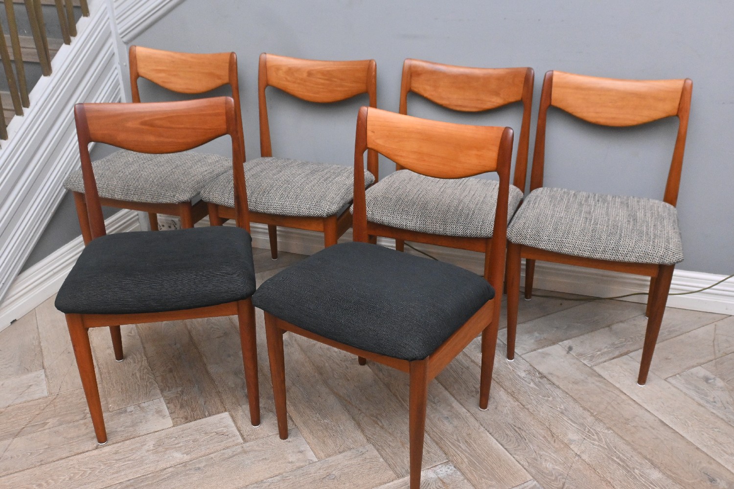 A SET OF SIX MID-CENTURY UPHOLSTERED DINING CHAIRS (A/F) (79H X 48W X 48D CM) (LEONARD JOEL DELIVERY SIZE: X-LARGE)