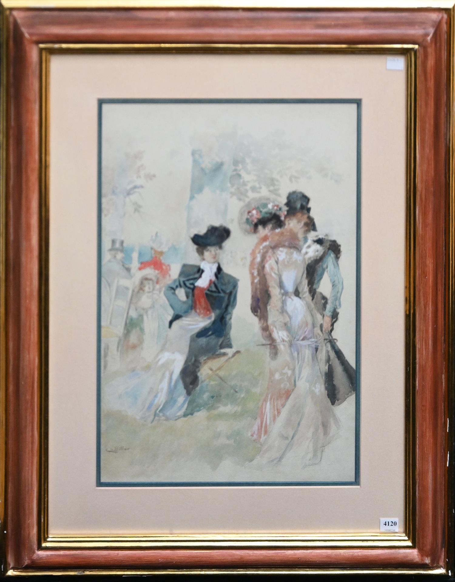 CHARLES BILLON, (ELEGANT LADIES), WATERCOLOUR AND GOUACHE ON PAPER, SIGNED LOWER LEFT, 52 X 35CM, FRAME SIZE: 80 X 63CM