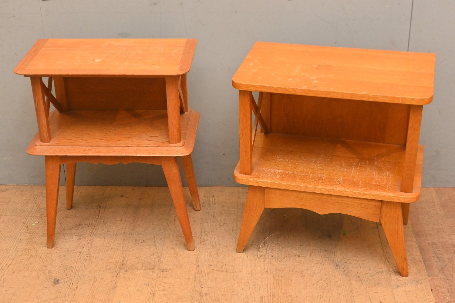 TWO RETRO TEAK BEDSIDE TABLES (A/F) (57H X 50W X 30D CM) (LEONARD JOEL DELIVERY SIZE: LARGE)