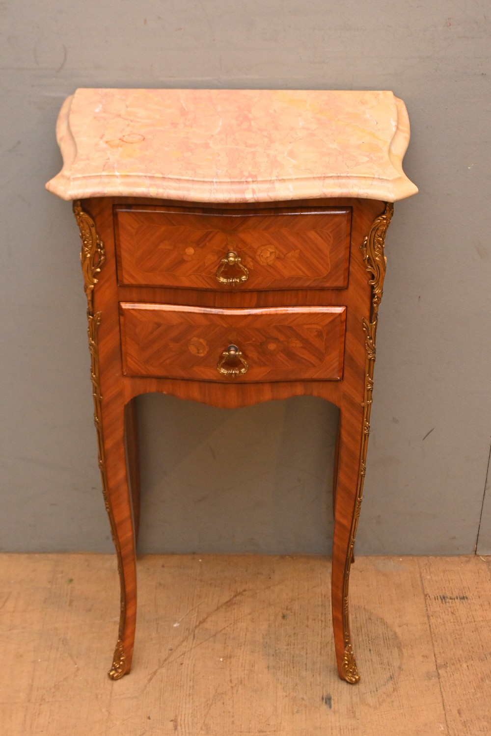 A LOUIS XV STYLE MARBLE AND MARQUETRY BEDSIDE CABINET (73H X 41W X 29D CM) (LEONARD JOEL DELIVERY SIZE: X-LARGE)