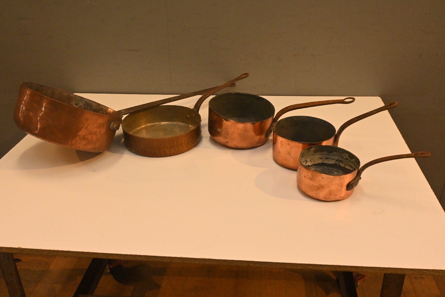 A COLLECTION OF FIVE COPPER SAUCEPANS (78W CM) (LEONARD JOEL DELIVERY SIZE: LARGE)