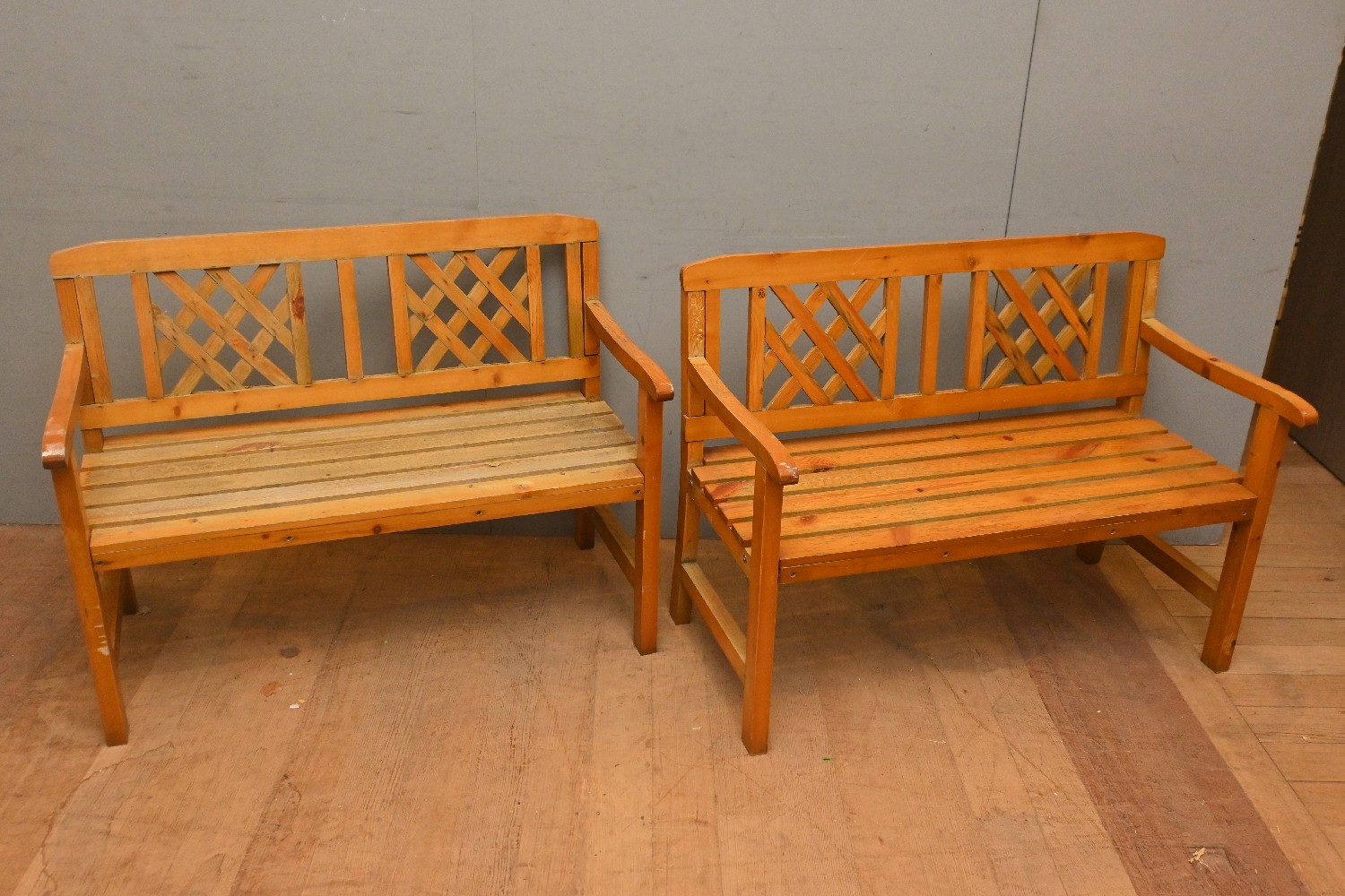 A PAIR OF VINTAGE TWO SEATER BENCHES OF SLATTED FORM (A/F) (78H X 102W X 52D CM) (LEONARD JOEL DELIVERY SIZE: X-LARGE)