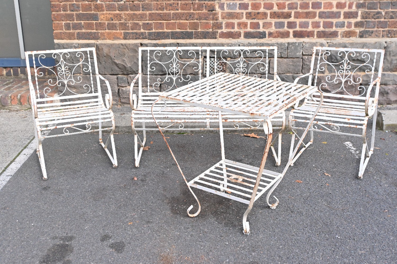A FOUR PIECE WROUGHT METAL OUTDOOR SET INCLUDING TABLE, TWO SINGLE ARMCHAIRS AND A TWIN SEAT BENCH (A/F) (BENCH 79H X 107W X 51D CM) (PLEASE NOTE THIS HEAVY ITEM MUST BE REMOVED BY CARRIERS AT THE CUSTOMER'S EXPENSE. LEONARD JOEL STAFF CANNOT ASSIST CARRYING THIS ITEM) (LARGE ITEM)