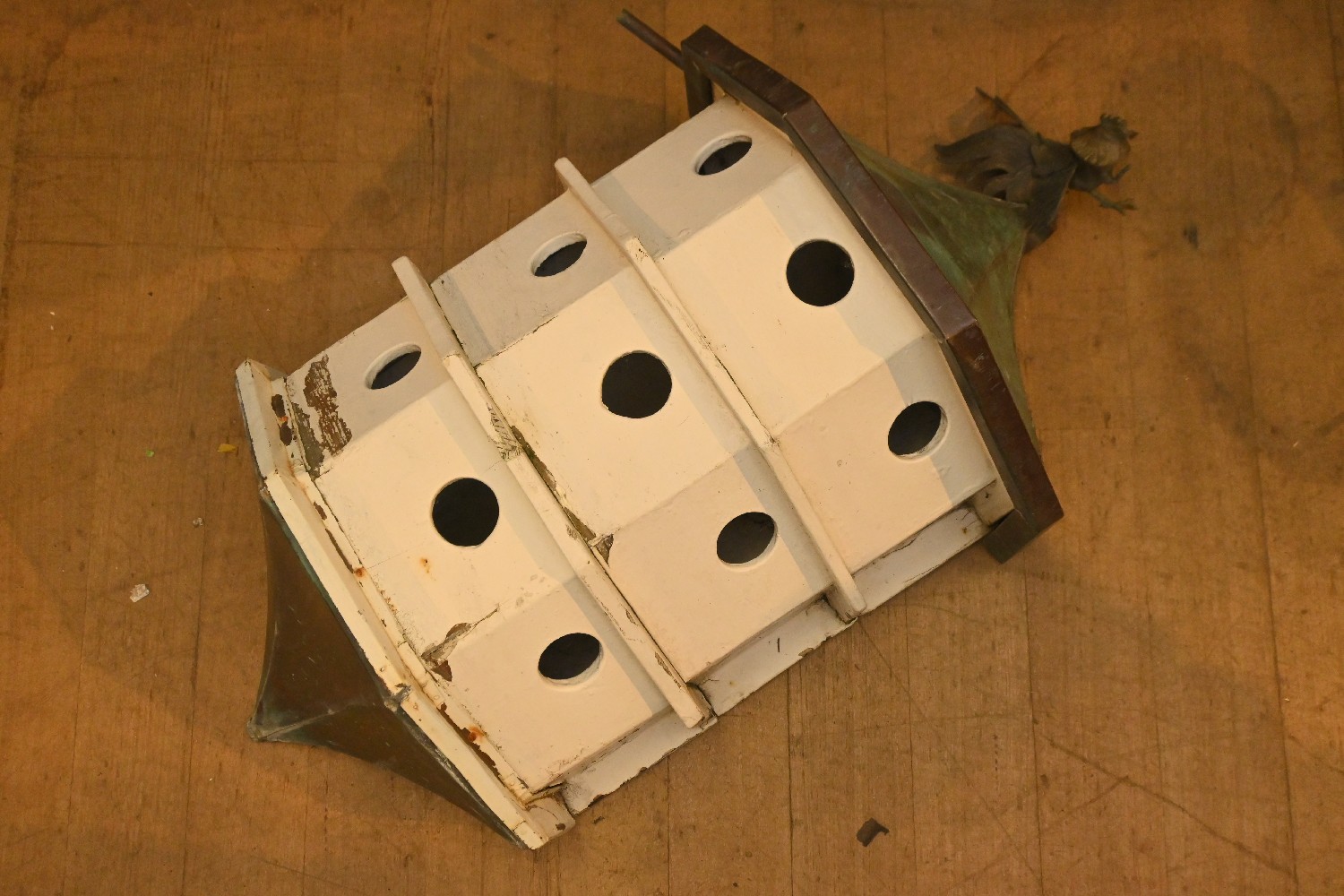 AN EARLY 20th CENTURY WOODEN AND COPPER BIRD NESTING BOX OF ARCHITECTURAL FORM (A/F) (100H X 58W X 42D CM) (LEONARD JOEL DELIVERY SIZE: LARGE)