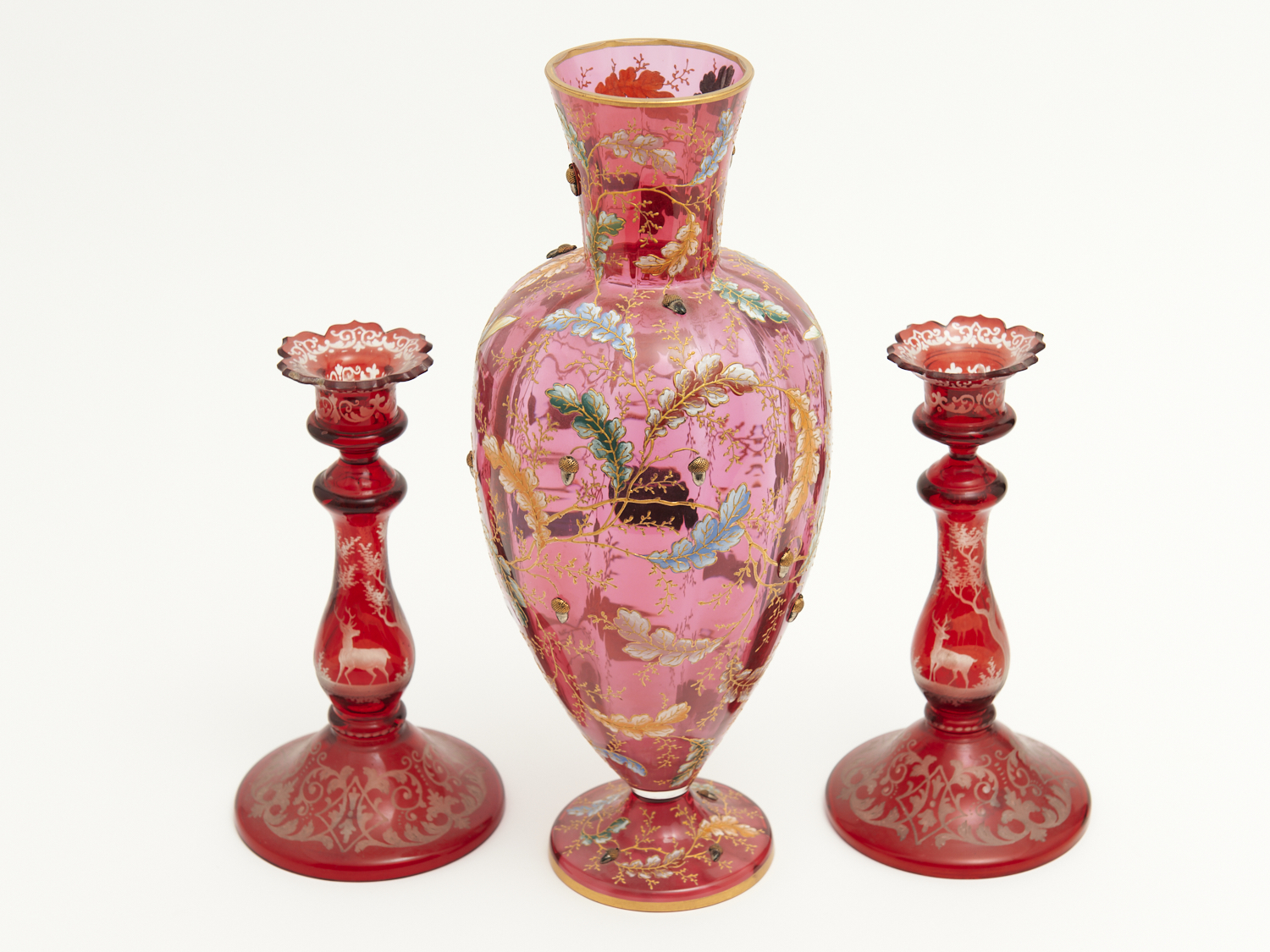 A RUBY GLASS VASE AND TWO CANDLESTICKS H.36CM (VASE), LEONARD JOEL DELIVERY SIZE: MEDIUM