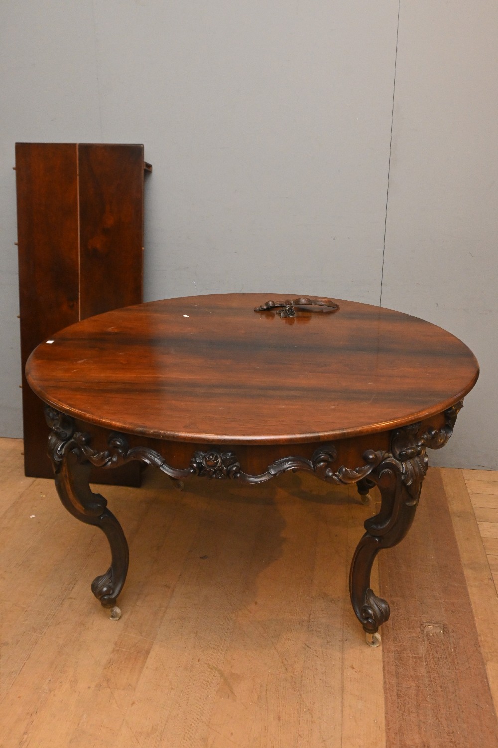 A VICTORIAN ROSEWOOD EXTENDING DINING TABLE, WITH ONE SPARE LEAF (A/F) (75H X 132W X 132D CM) (PLEASE NOTE THIS HEAVY ITEM MUST BE REMOVED BY CARRIERS AT THE CUSTOMER'S EXPENSE. LEONARD JOEL STAFF CANNOT ASSIST CARRYING THIS ITEM) (LARGE ITEM)