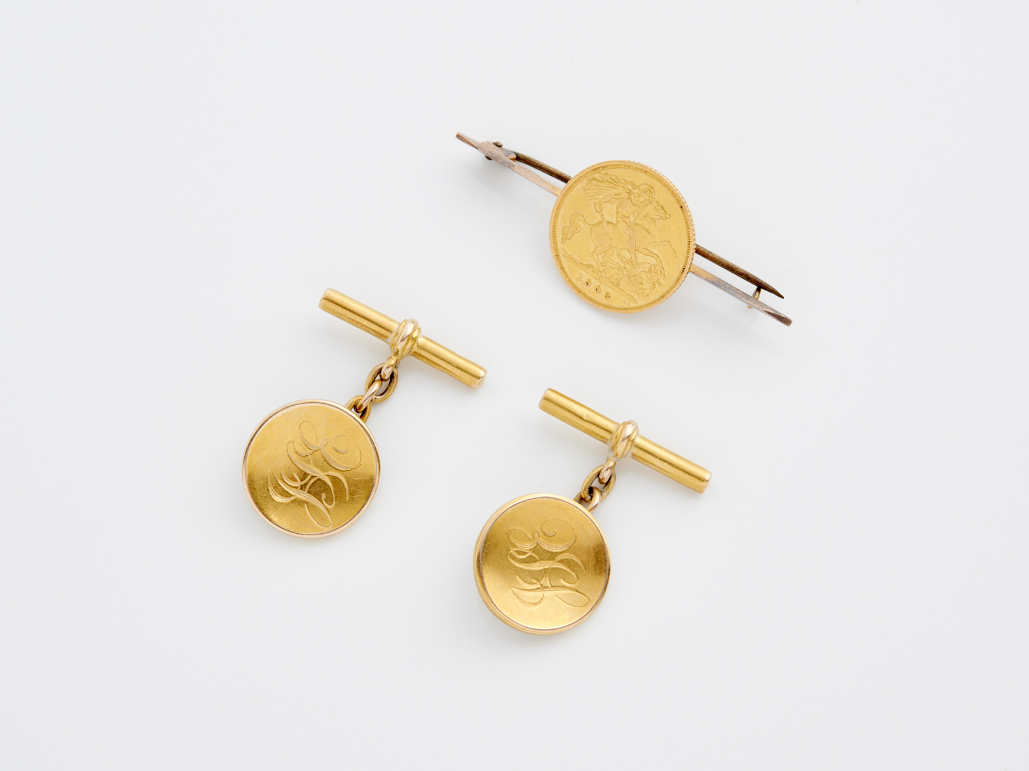 WILLIAM DRUMMOND, A PAIR OF CUFFLINKS IN 15CT GOLD, TOGETHER WITH A HALF SOVEREIGN BAR BROOCH IN 9CT AND 22CT GOLD