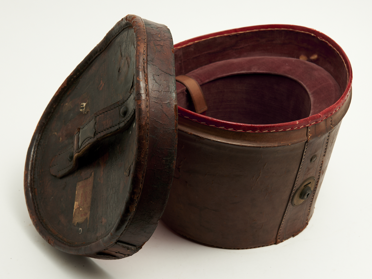 AN ANTIQUE LEATHER TRAVELLING TOP HAT BOX W.36CM, LEONARD JOEL DELIVERY SIZE: SMALL