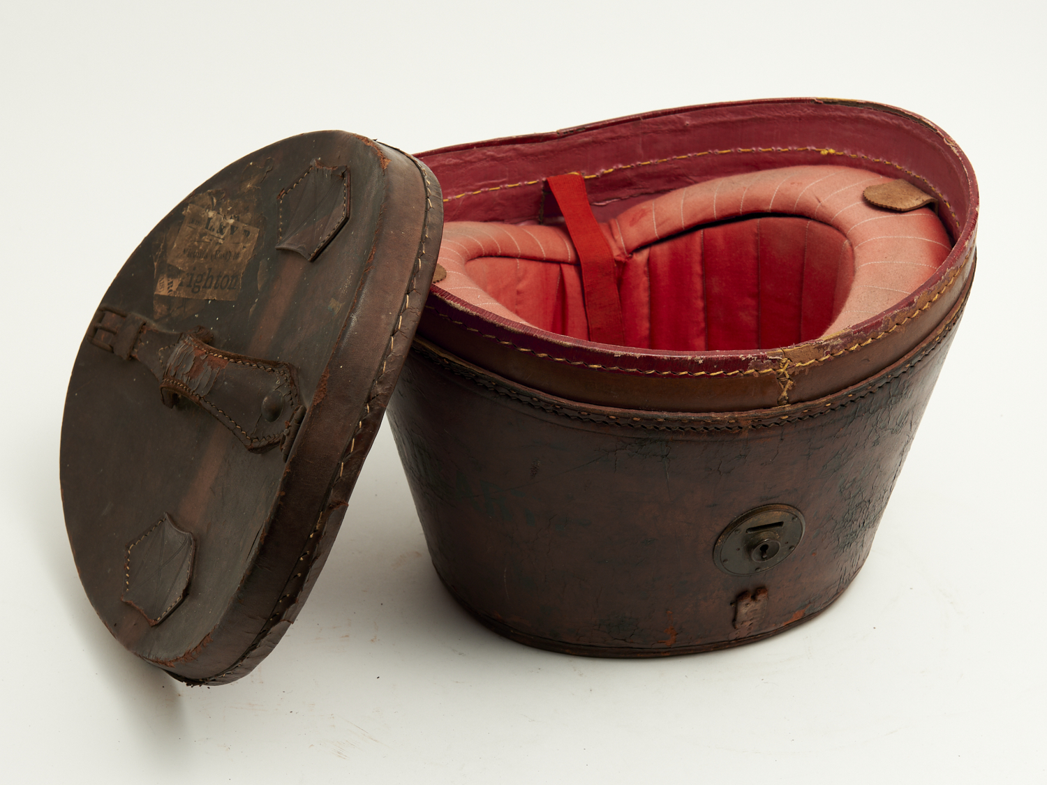 AN ANTIQUE LEATHER TRAVELLING TOP HAT BOX W.36CM, LEONARD JOEL DELIVERY SIZE: SMALL