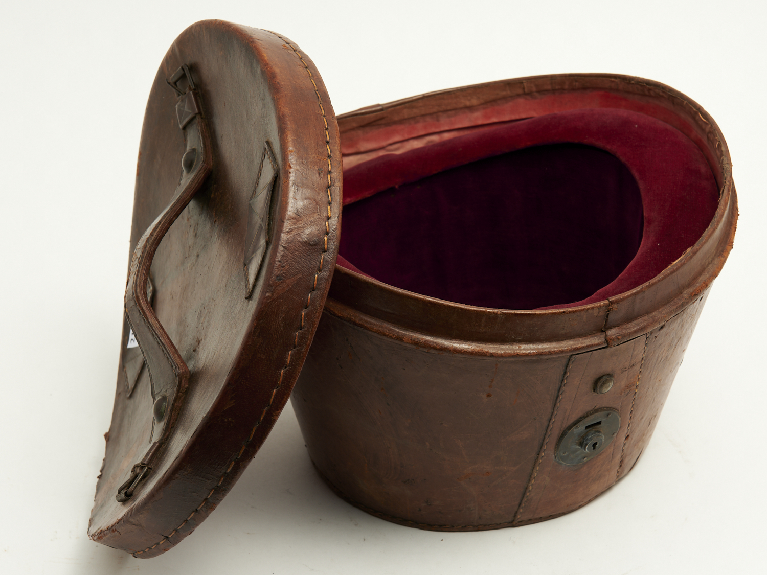 AN ANTIQUE LEATHER TRAVELLING TOP HAT BOX W.33CM, LEONARD JOEL DELIVERY SIZE: SMALL