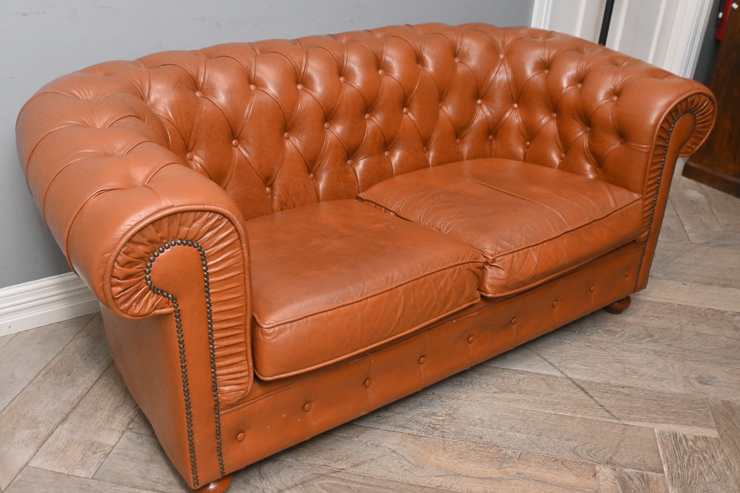 A MODERN TWO SEATER TAN LEATHER CHESTERFIELD STYLE SOFA (A/F) (72H X 163W X 84D CM) (PLEASE NOTE THIS HEAVY ITEM MUST BE REMOVED BY CARRIERS AT THE CUSTOMER'S EXPENSE. LEONARD JOEL STAFF CANNOT ASSIST CARRYING THIS ITEM) (LARGE ITEM)