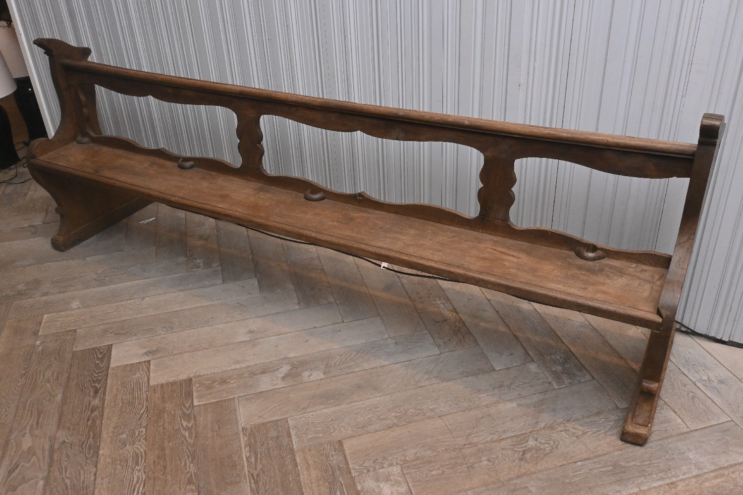 A LONG 19th CENTURY FRENCH OAK CHURCH PEW (98H X 278W X 65D CM) (PLEASE NOTE THIS HEAVY ITEM MUST BE REMOVED BY CARRIERS AT THE CUSTOMER'S EXPENSE. LEONARD JOEL STAFF CANNOT ASSIST CARRYING THIS ITEM) (LARGE ITEM)