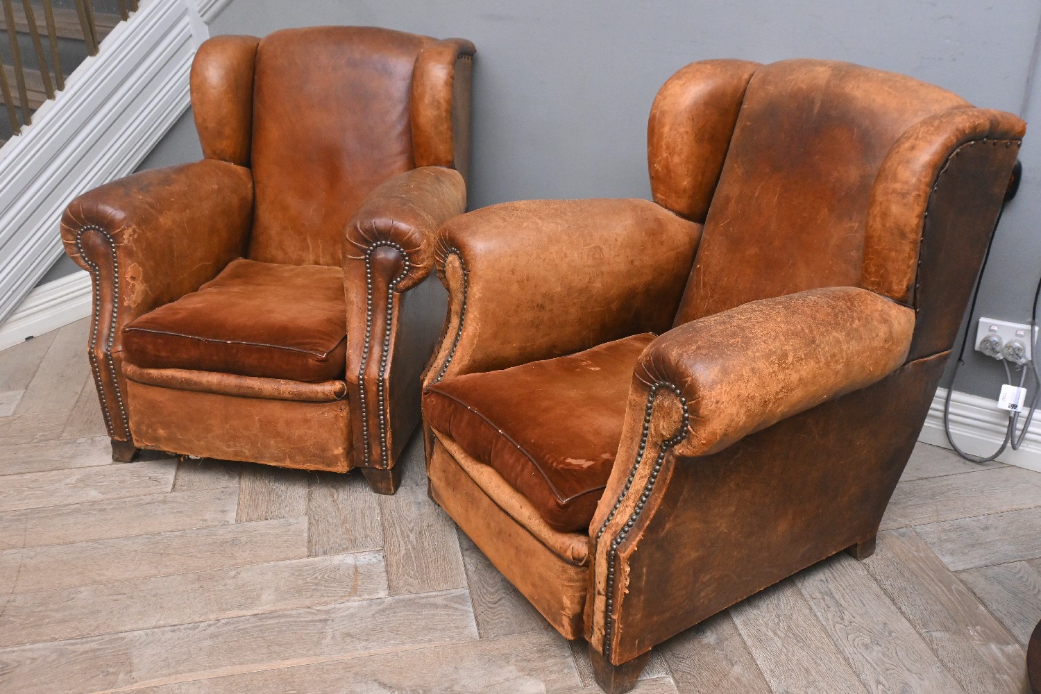 A PAIR OF FRENCH ART DECO LEATHER CLUB CHAIRS (A/F) (86H X 85W X 85D CM) (PLEASE NOTE THIS HEAVY ITEM MUST BE REMOVED BY CARRIERS AT THE CUSTOMER'S EXPENSE. LEONARD JOEL STAFF CANNOT ASSIST CARRYING THIS ITEM) (LARGE ITEM)