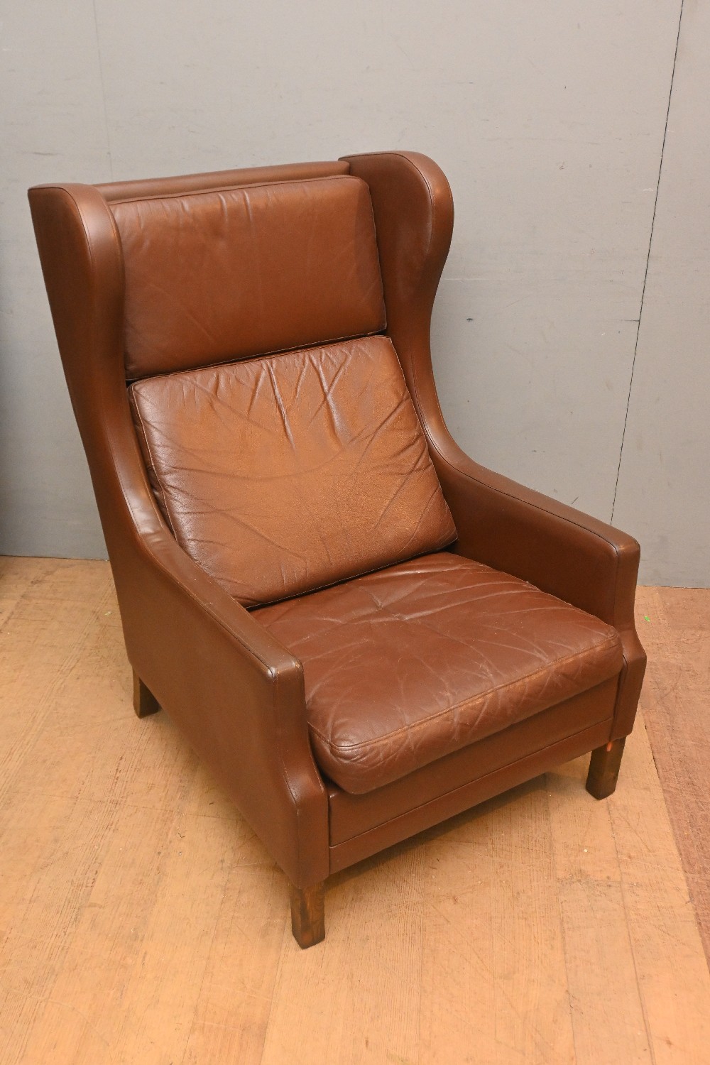 A BROWN LEATHER WINGBACK ARMCHAIR (A/F) (102H X 69W X 91D CM) (LEONARD JOEL DELIVERY SIZE: X-LARGE)