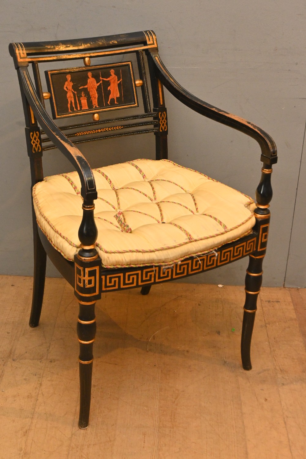 AN EBONIZED AND PAINTED RATTAN WEAVE ARMCHAIR (A/F) (84H X 52W X 62D CM) (LEONARD JOEL DELIVERY SIZE: LARGE)