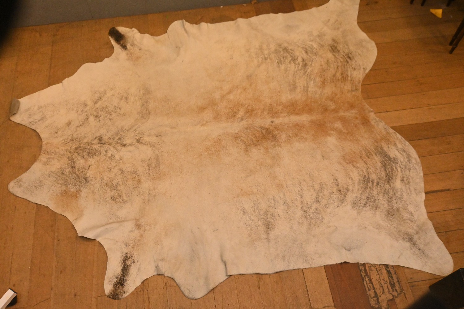 A VINTAGE COWHIDE RUG - SIGNS OF REPAIR (A/F) (234 X 213 CM) (LEONARD JOEL DELIVERY SIZE: X-LARGE)