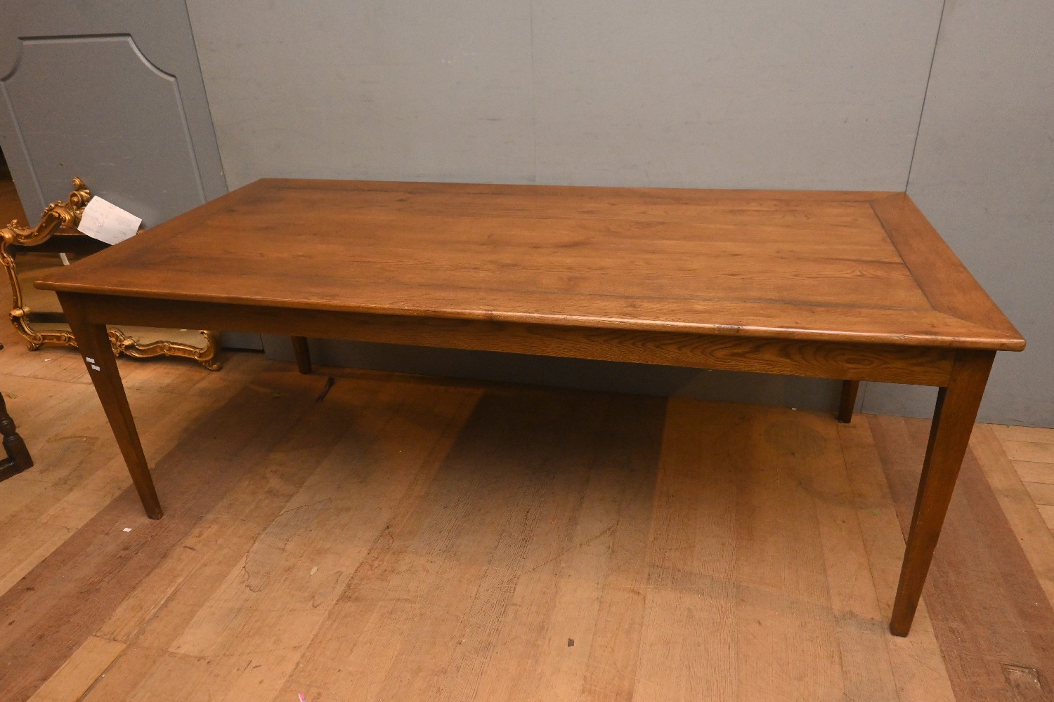 A FARMHOUSE-STYLE OAK DINING TABLE (77H X 210W X 101D CM) (PLEASE NOTE THIS HEAVY ITEM MUST BE REMOVED BY CARRIERS AT THE CUSTOMER'S EXPENSE. LEONARD JOEL STAFF CANNOT ASSIST CARRYING THIS ITEM) (LARGE ITEM)