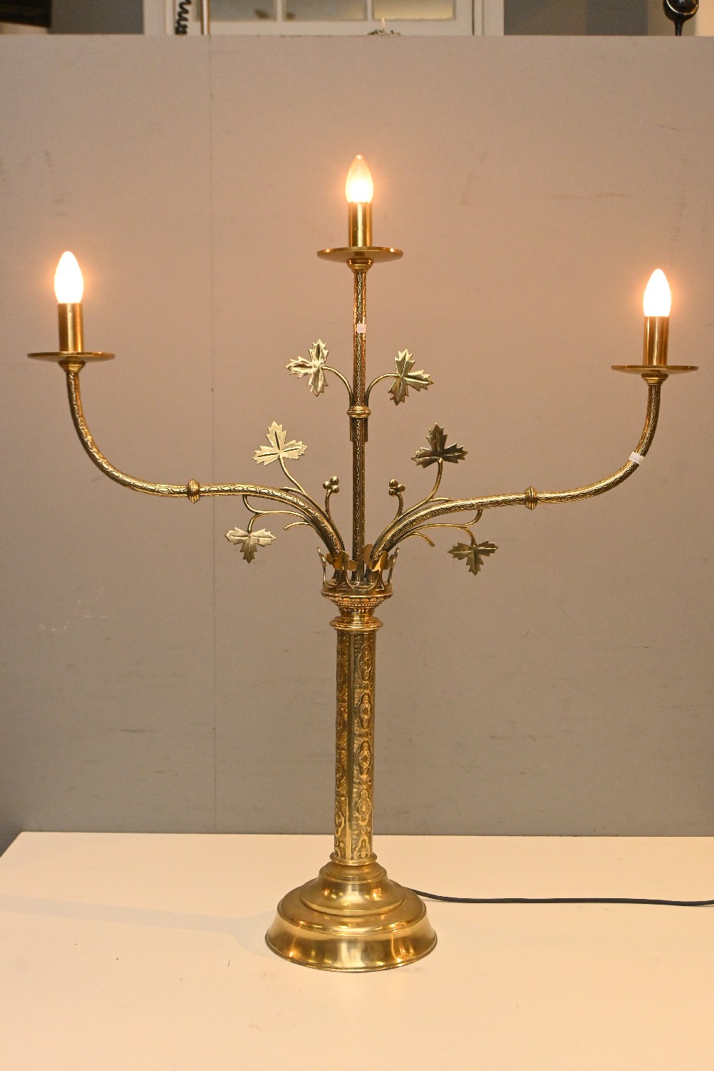 AN ECCLESTIASTICAL BRASS THREE-LIGHT CANDELABRUM (106H X 87W CM) (LEONARD JOEL DELIVERY SIZE: LARGE)