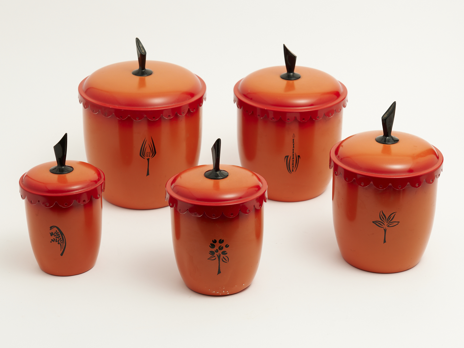 A SET OF FIVE 1950S AUSTRALIAN FRANKLIN ORANGE ANODISED ALUMINIUM GRADUATED CANISTERS H.24CM, LEONARD JOEL DELIVERY SIZE: SMALL