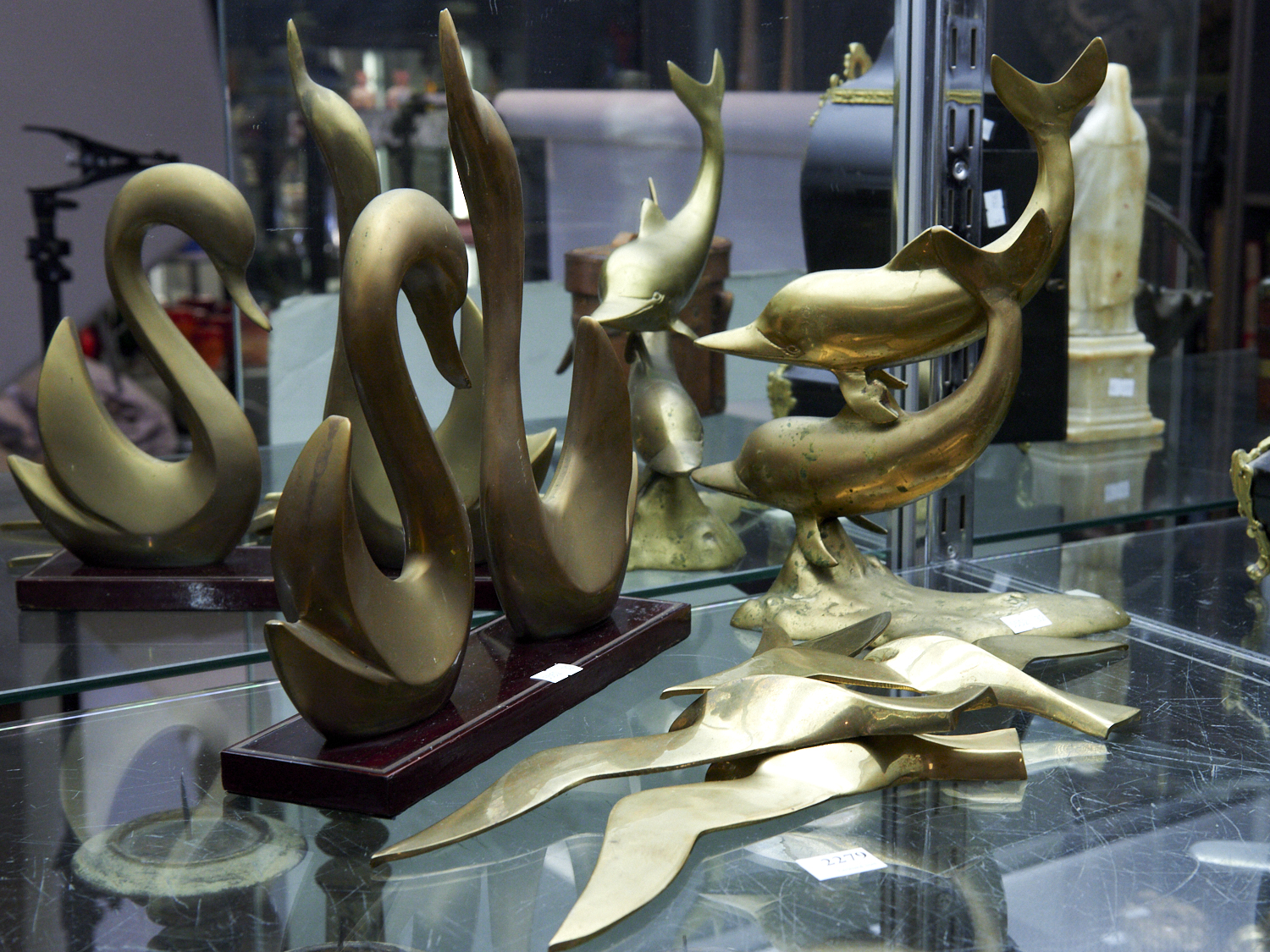 A SET OF THREE VINTAGE STYLISED BRASS FLYING SEAGULLS AND WOODEN-BASED BRASS DUCK AND BRASS DOLPHIN ORNAMENTS H.28CM (TALLEST), LEONARD JOEL DELIVERY SIZE: SMALL
