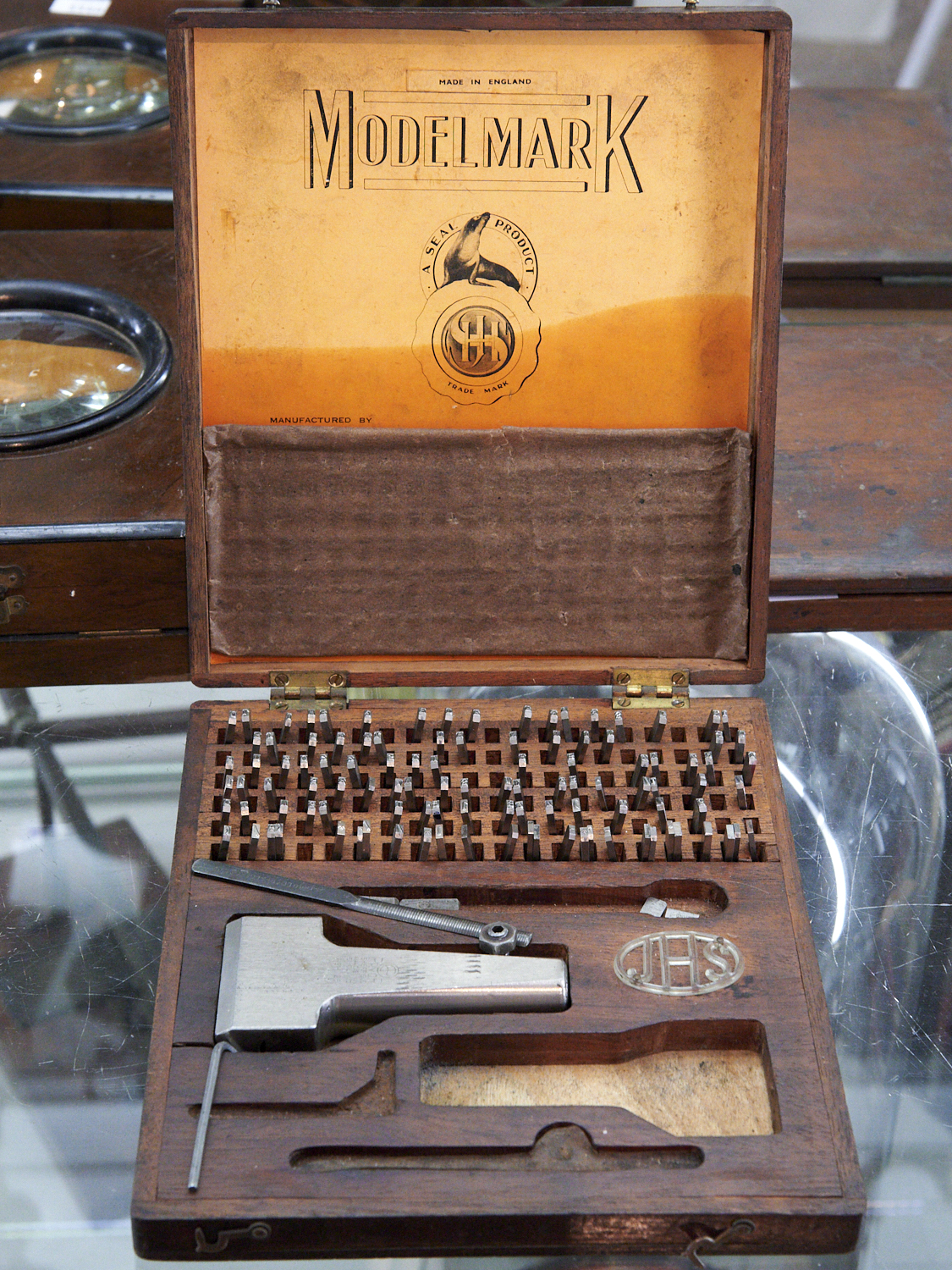 A 1930S WOODEN CASED MODELMARK ENGLISH LETTER STAMP SET L.22CM, LEONARD JOEL DELIVERY SIZE: SMALL