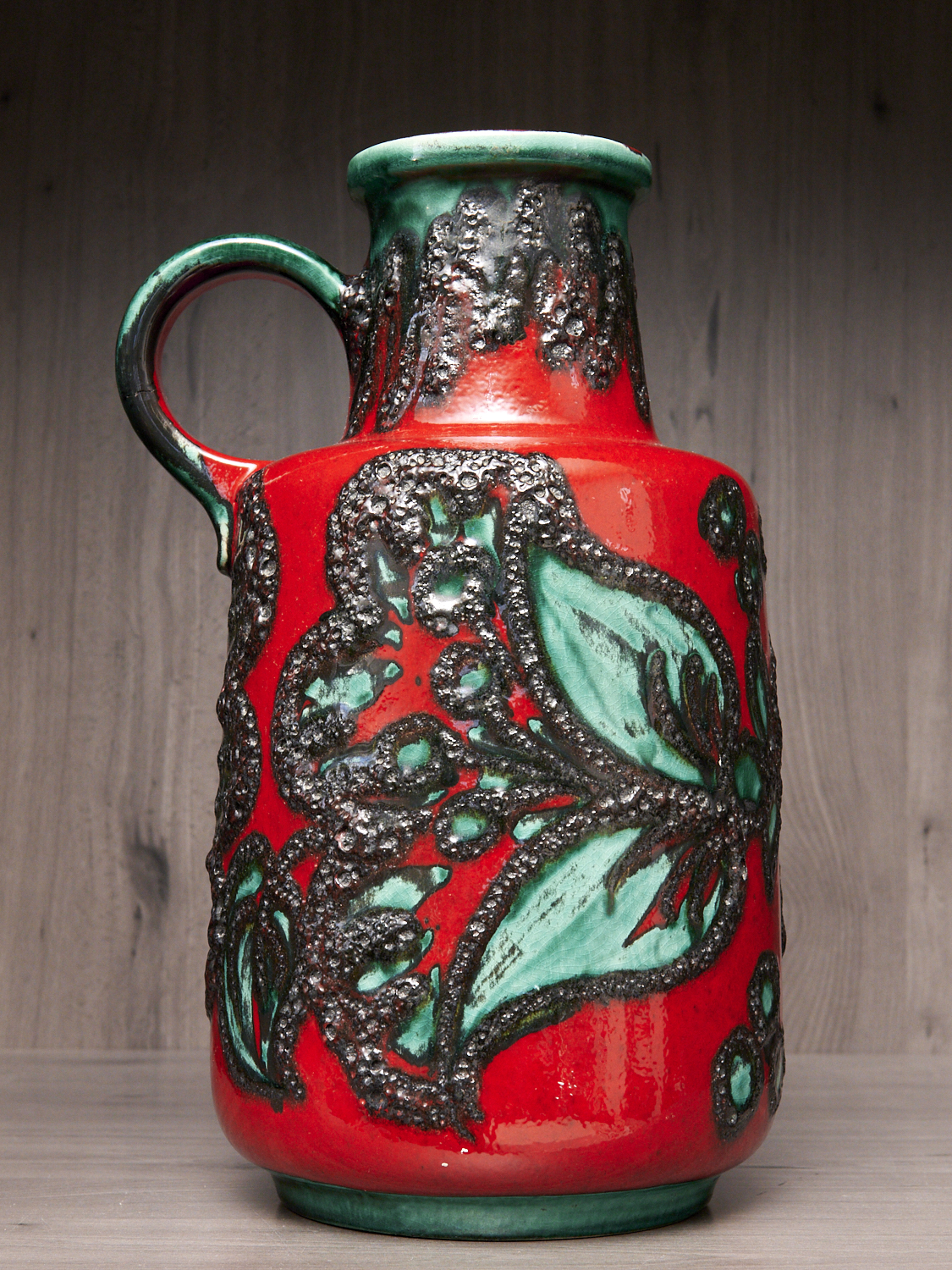 A SIGNED WEST GERMAN 408-40 FAT LAVA GLAZE RED AND GREEN JUG VASE H.39CM, LEONARD JOEL DELIVERY SIZE: MEDIUM