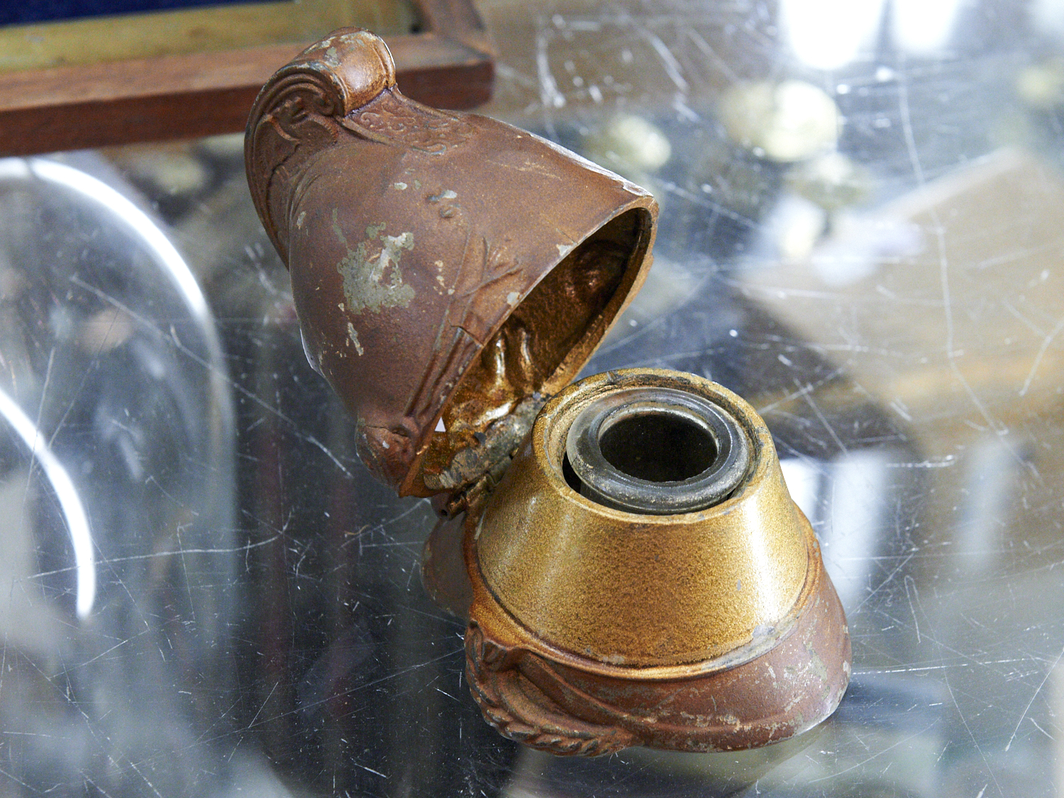 A 1900S ENGLISH COLD PAINTED SPELTER FIREMAN'S HELMET-FORM INKWELL H.10CM, LEONARD JOEL DELIVERY SIZE: SMALL