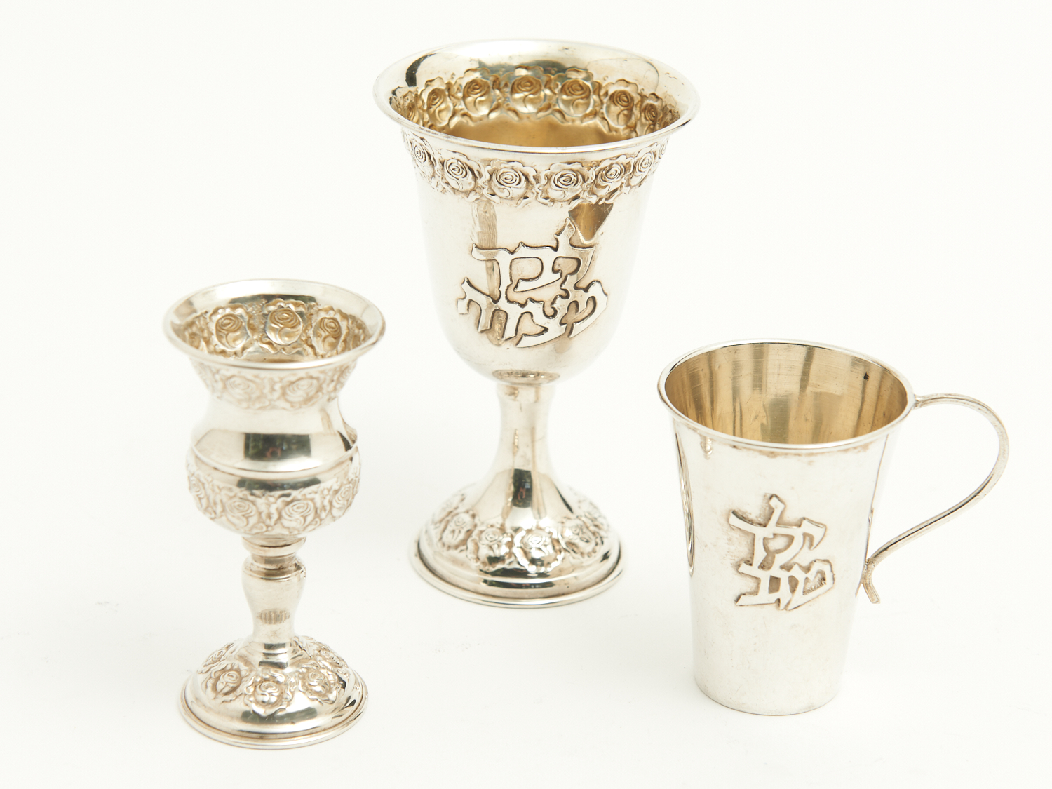 THREE PIECES OF JEWISH 800 AND STERLING SILVER INCL. TWO SILVER GOBLETS AND A HANDLED CUP H.11CM (TALLEST) 100G, LEONARD JOEL DELIVERY SIZE: SMALL