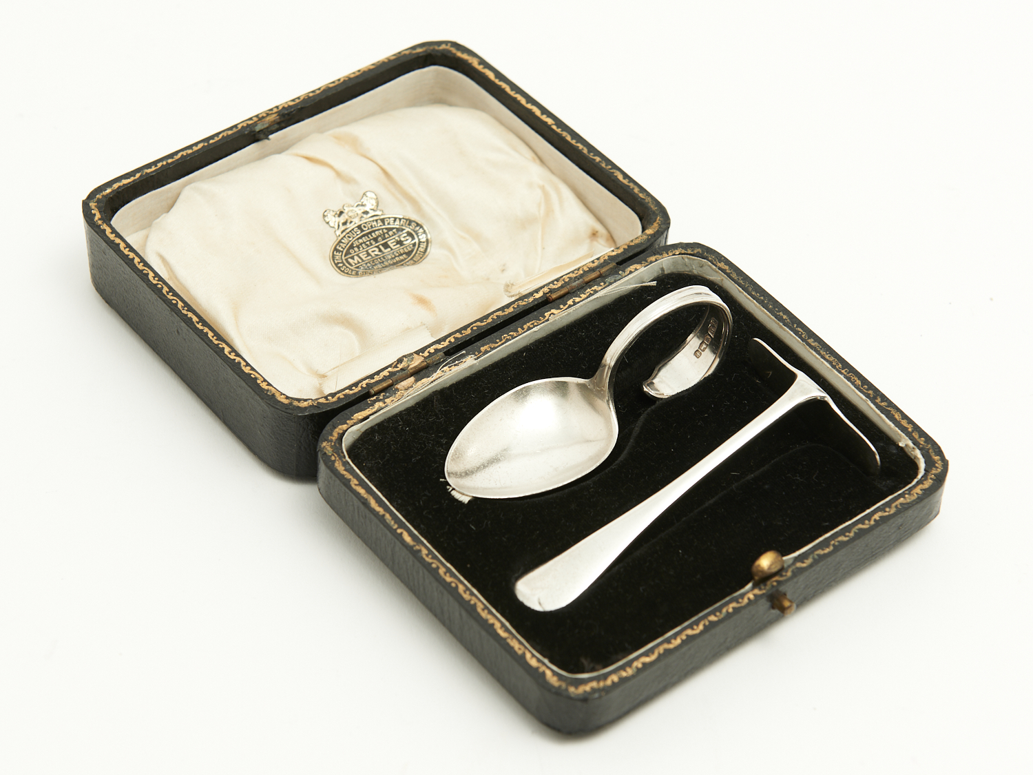 A CASED HALLMARKED ENGLISH STERLING SILVER BABY PUSHER AND SPOON SET L.12.5CM (BOX) 44G, LEONARD JOEL DELIVERY SIZE: SMALL