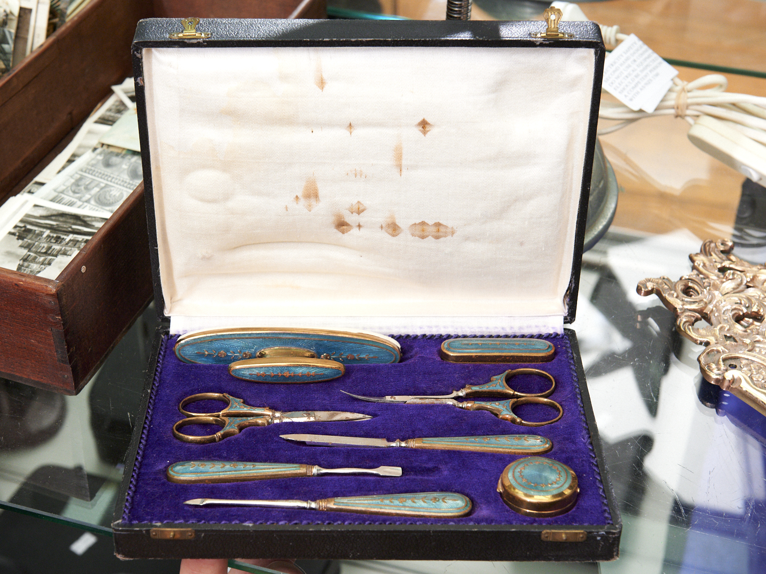 A CASED VINTAGE FRENCH GUILOCHE ENAMEL GILT BRASS MANICURE SET (A/F) L.22.5CM, LEONARD JOEL DELIVERY SIZE: SMALL