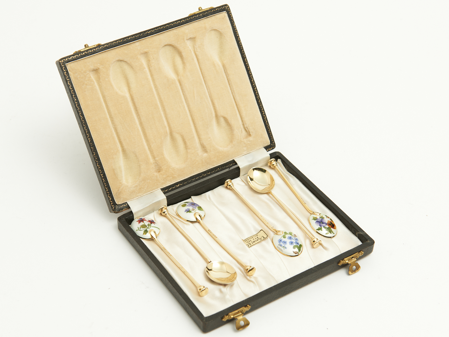 A CASED SET OF SIX ENGLISH HALLMARKED STERLING SILVER AND ENAMELLED SPOONS L.16CM (BOX) 60G (TOTAL WEIGHT), LEONARD JOEL DELIVERY SIZE: SMALL