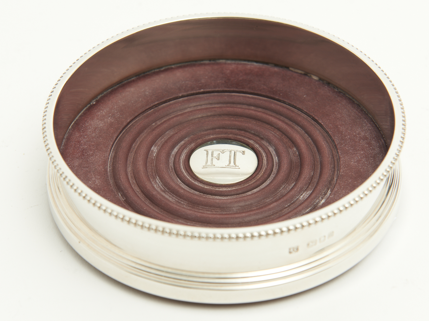 A HEAVY GAUGE STERLING SILVER AND WOODEN BOTTLE COASTER DIA.12.5CM, LEONARD JOEL DELIVERY SIZE: SMALL