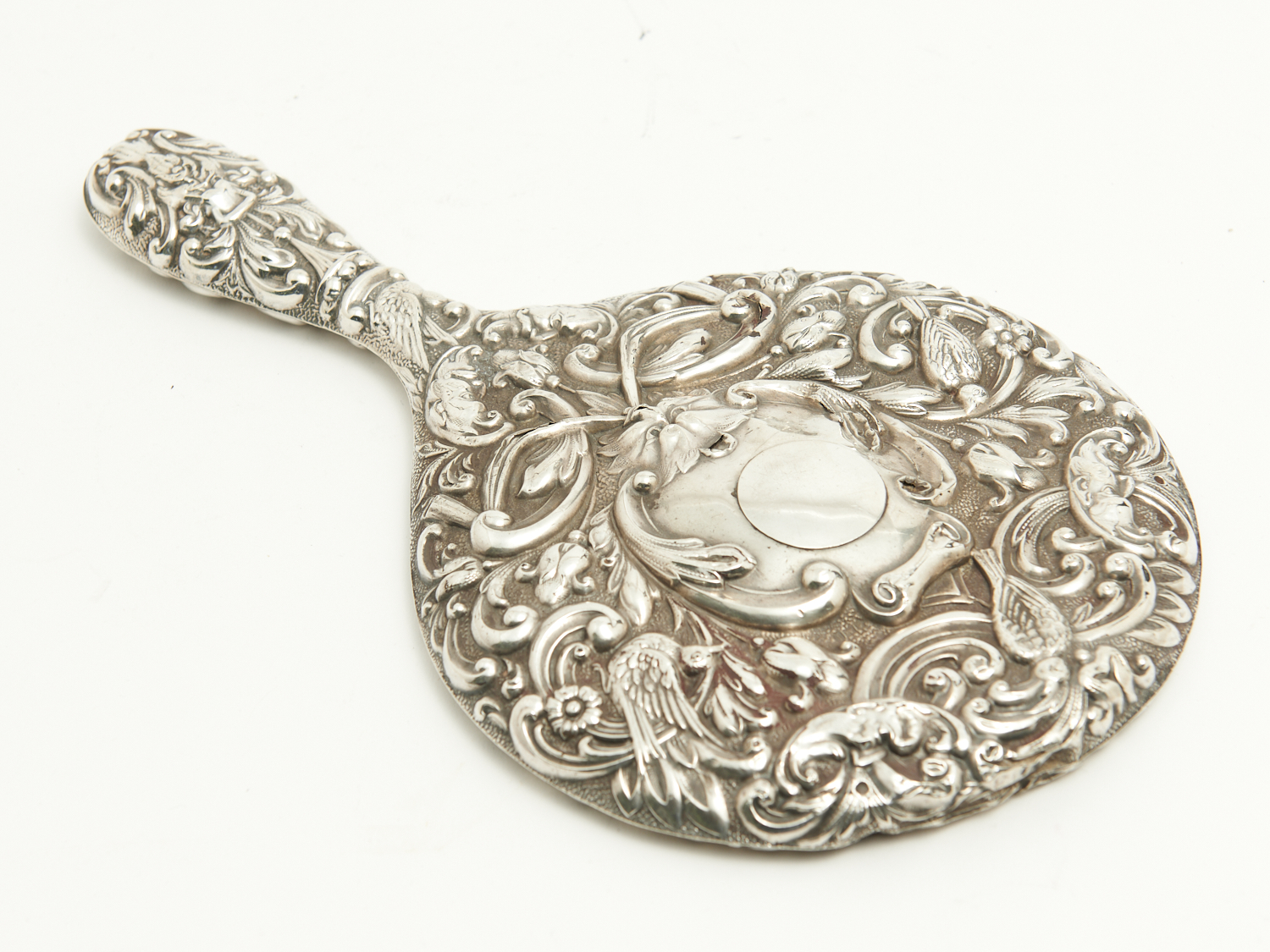 AN ENGLISH HALLMARKED STERLING SILVER MASK HEAD AND BIRD DECORATED HAND MIRROR L.27CM, LEONARD JOEL DELIVERY SIZE: SMALL
