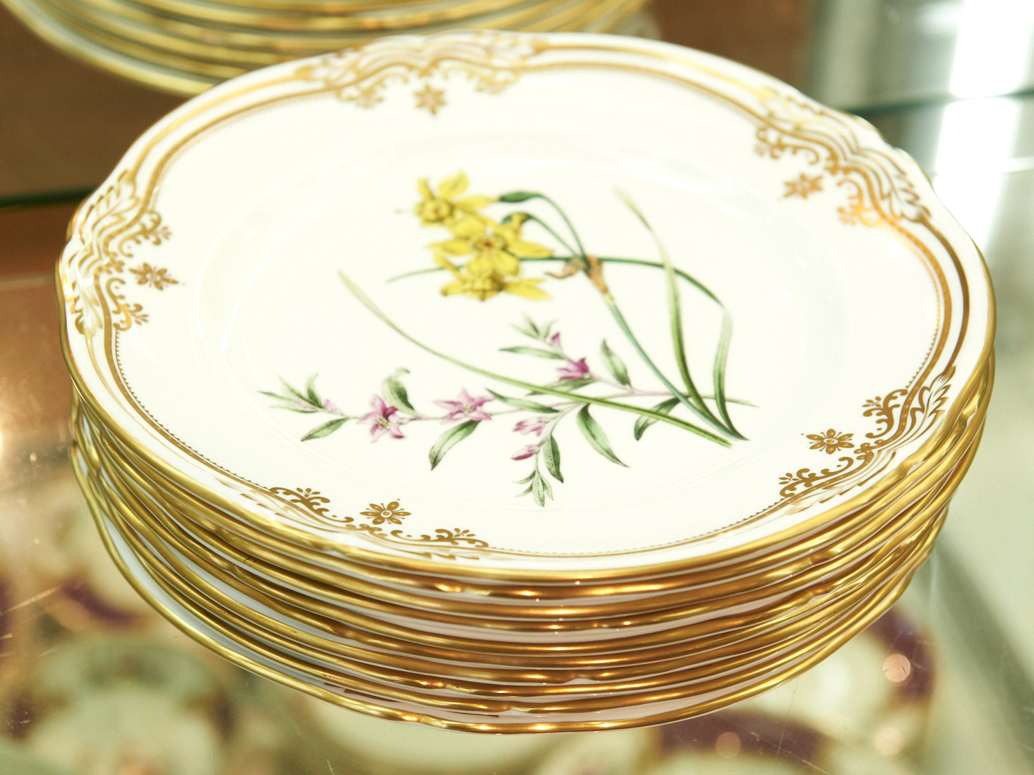 A FINE SET OF TEN HAND PAINTED AND GILDED SPODE STAFFORD FLOWERS DINNER PLATES DIA.23.5CM, LEONARD JOEL DELIVERY SIZE: MEDIUM