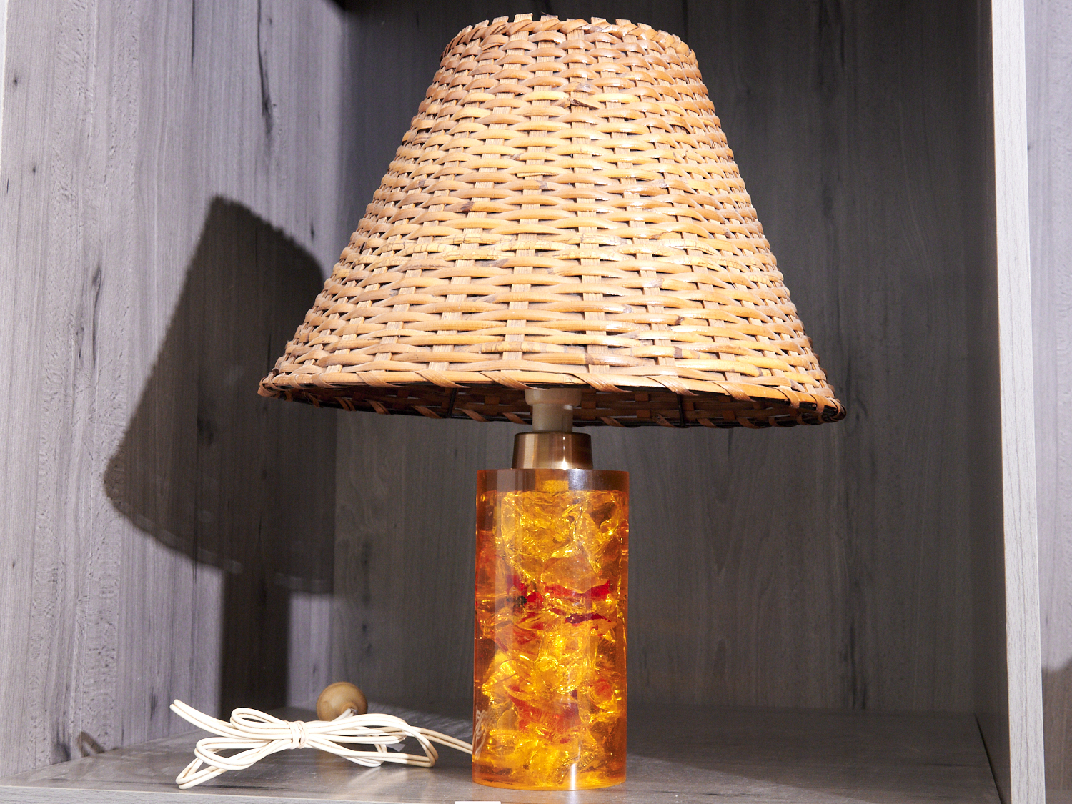 A 1950S RETRO PERSPEX ORANGE CYLINDER BASED ORIGINAL CANE SHADE TABLE LAMP H.44CM, LEONARD JOEL DELIVERY SIZE: SMALL