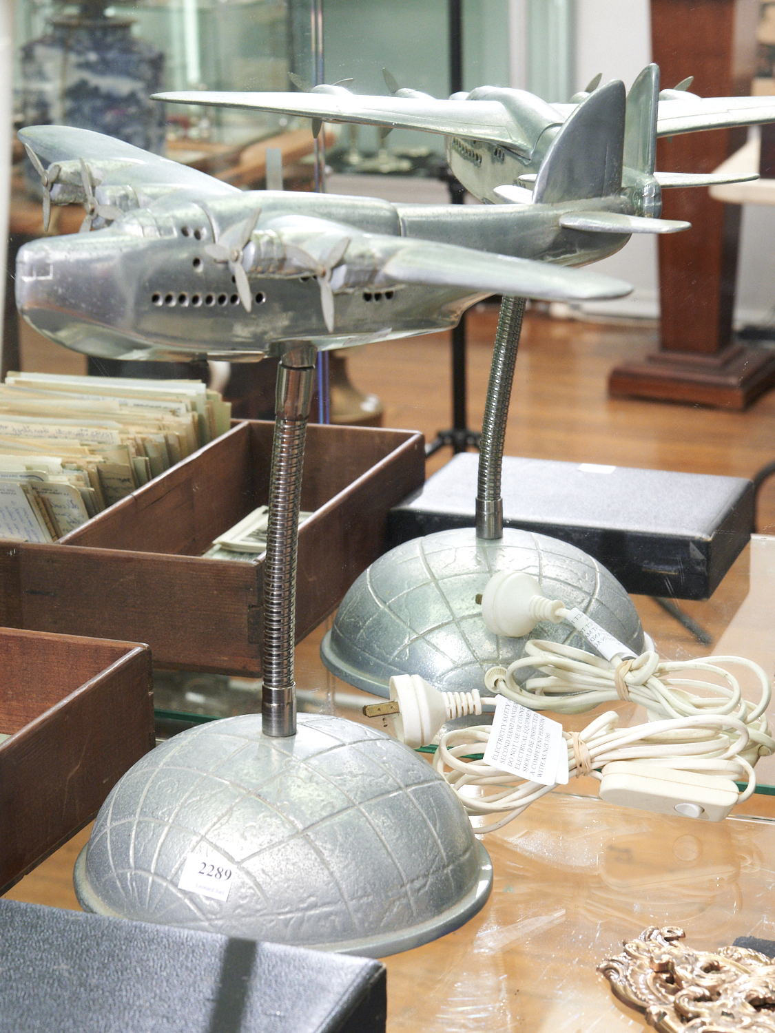 A 1950S ALUMINIUM FOUR PROP MOUNTED AEROPLANE DESK LAMP H.38CM, LEONARD JOEL DELIVERY SIZE: SMALL