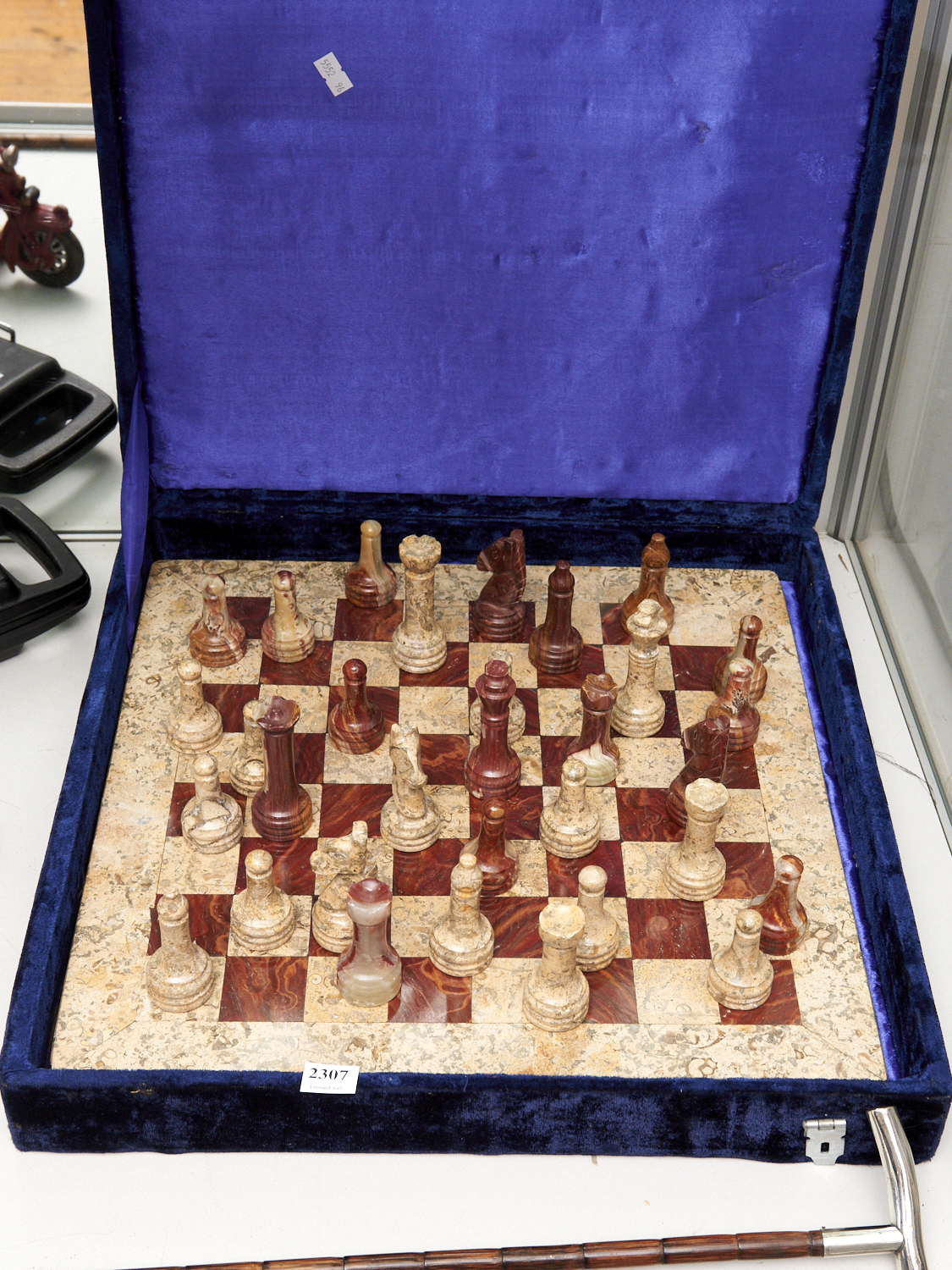 A VINTAGE MARBLE CHESSBOARD IN CASE WITH COMPLETE SET OF CARVED CHESS PIECES 40 X 40CM, LEONARD JOEL DELIVERY SIZE: SMALL