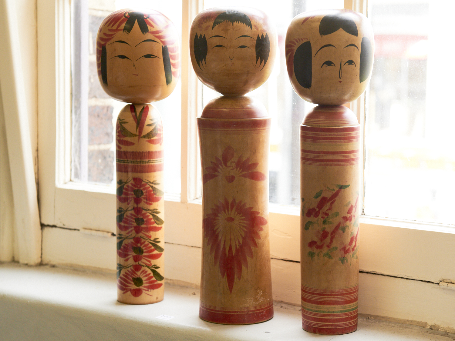 THREE LARGE HAND PAINTED WOODEN KOKESHI DOLLS H.46CM, LEONARD JOEL DELIVERY SIZE: MEDIUM